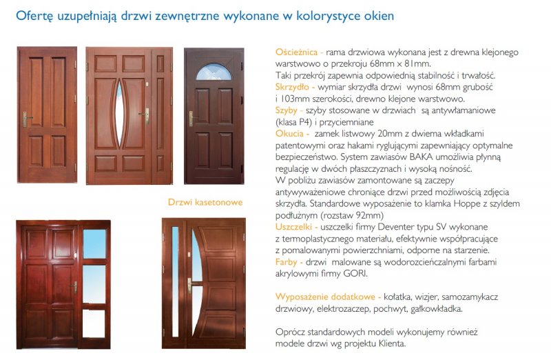 - specjalne kształty uszczelki przymykowej i przyszybowej oraz odpowiednie okucia zapewniają wysoką szczelność na przenikanie przez drzwi wody i powietrza